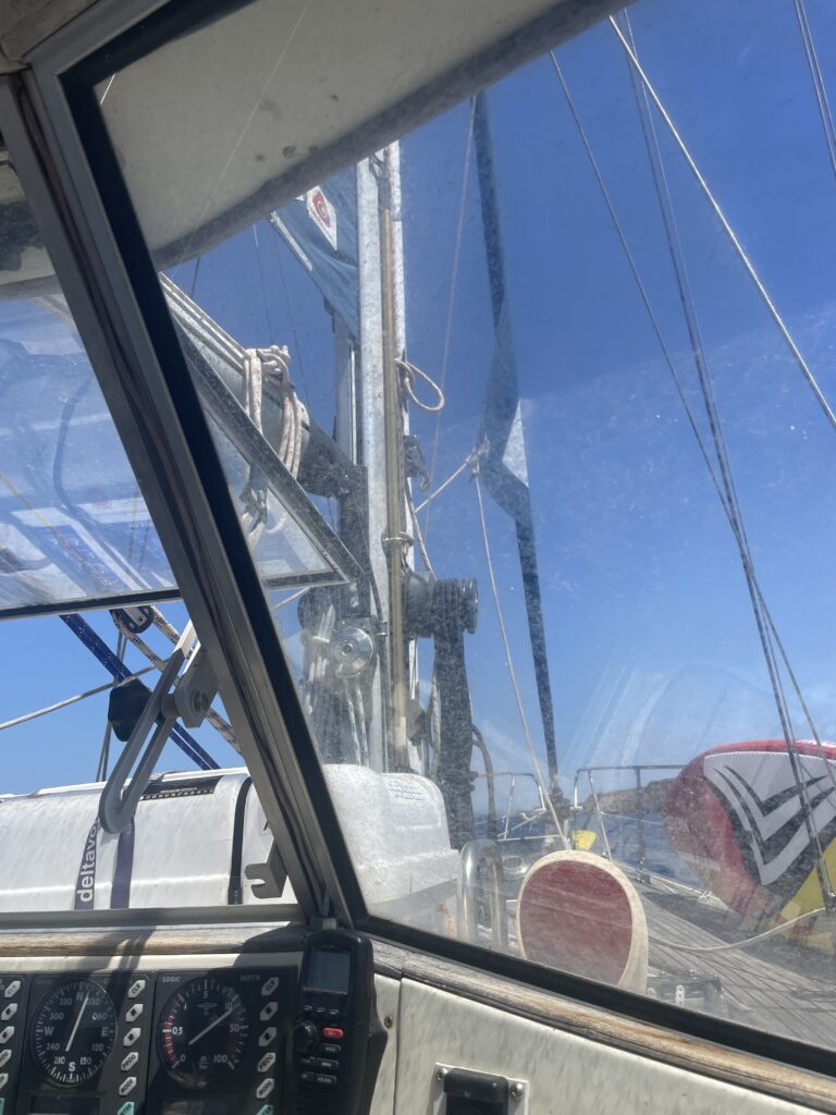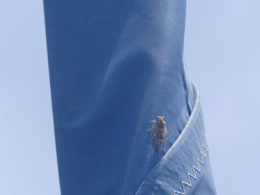 12h30 on entend un grésillement dans le bateau et on ne comprend pas d’où il vient. On coupe navigation instrument mais il continu. On se rend compte qu’une cigale s’est installée sur le génois. On décide donc de traverser au moteur avec seulement la grande voile pour laisser la cigale tranquille. Sinon elle risquerait de se noyer au milieu de la mer.