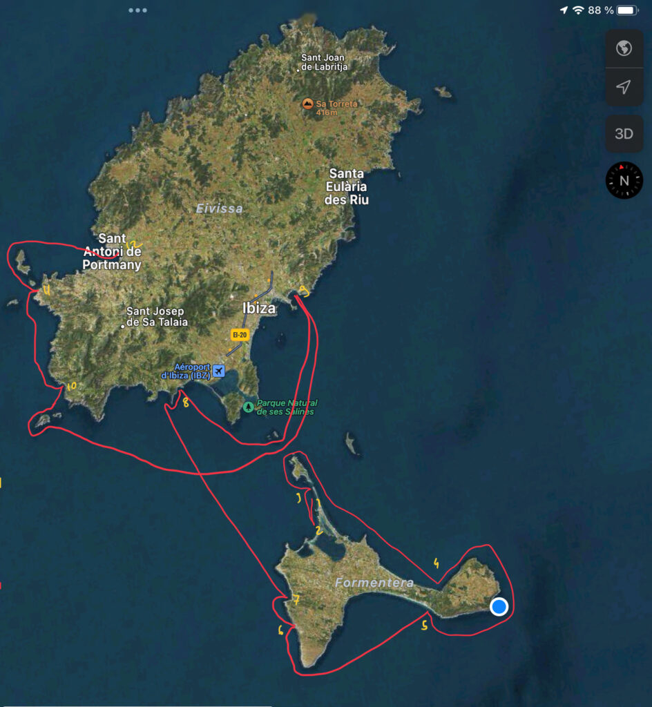9h30 on lève l’ancre après le petit déjeuner pour se rapprocher de la ville de formentera pour faire des courses. J’ai pris la barre jusqu’au nouveau mouillage. On a fait du moteur taud sailing. Il y avait 15noeuds de vent.