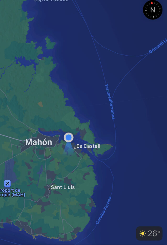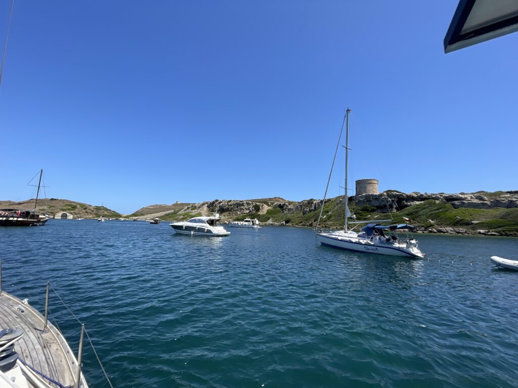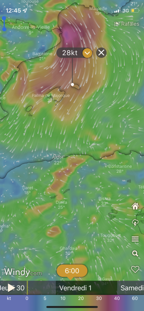 12h= le réseau commence à pointer son bout du nez. Nous pouvons mettre à jour notre carte météo qui confirme toujours un gros coup de vent au large nord de Minorque à 30 noeuds. Nous réfléchissons à un mouillage à l’abri. Mais vu que l’île n’es pas très montagneuse, il n’y a pas beaucoup de coin abrité.