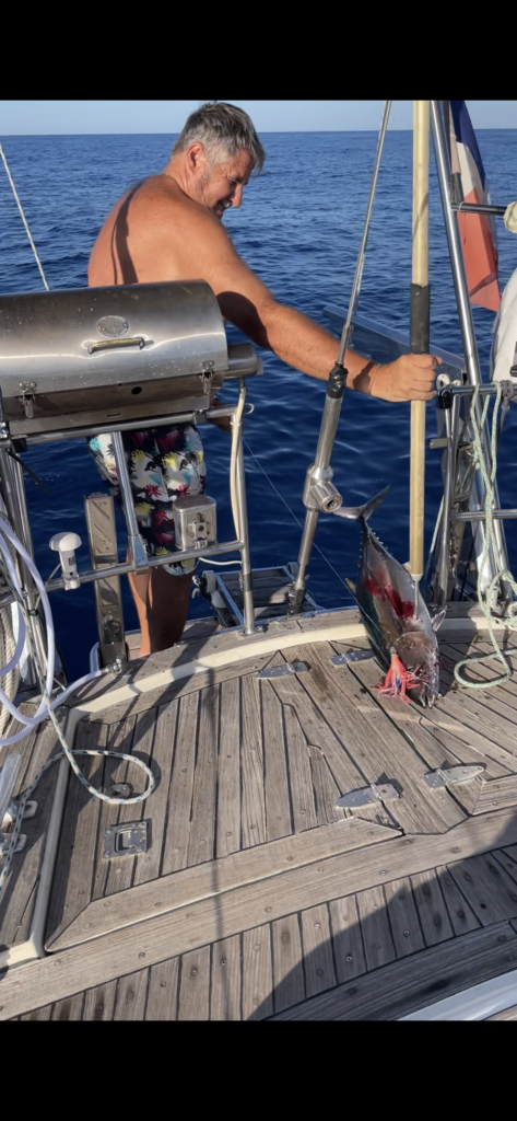 15h45= la ligne de pêche s’affole… et non ce n’est pas encore un sac plastique comme on a pris l’habitude de pêcher mais bien un thon ! Et pas un petit. 90cm de long. On a rentrée le génois rapidement car le vent forçait à ce moment là. Il ne s’est pas laissé faire. Quand il nous a vu il a fait un grand coup de nageoire et a replongeons malgré le frein de la cannes à pêche. Impressionnant.