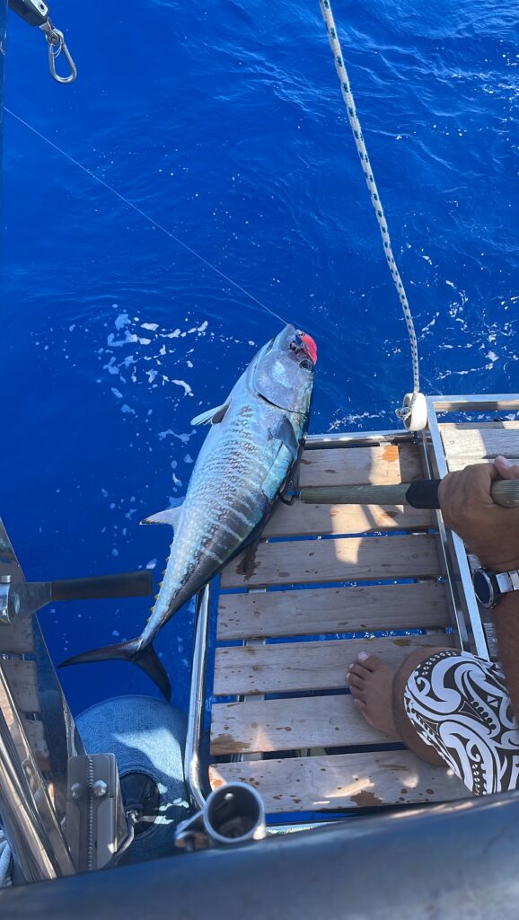 Pp pense que c’est un thon jaune. Il s’est carrément cassé la mâchoire en essayant de se libérer de l’hameçon :/. Le temps de s’occuper du poisson la houle s’est élevée rapidement à 30-50cm rend’a-t-il la manœuvre compliquée.