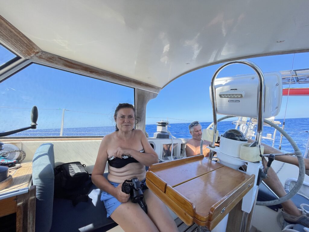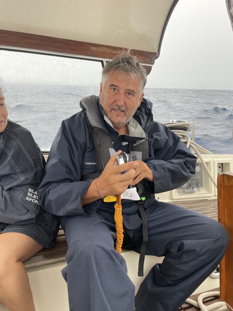 J’ai repris la barre pour maintenir notre cap au vent car l’auto pilote avait du mal à tenir. Avec la force du vent à 18 nœuds et la houle, la barre commençait à devenir dur.
