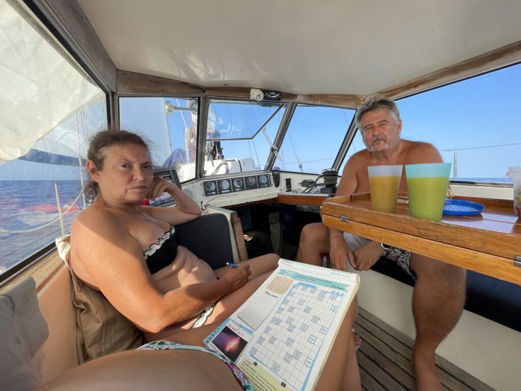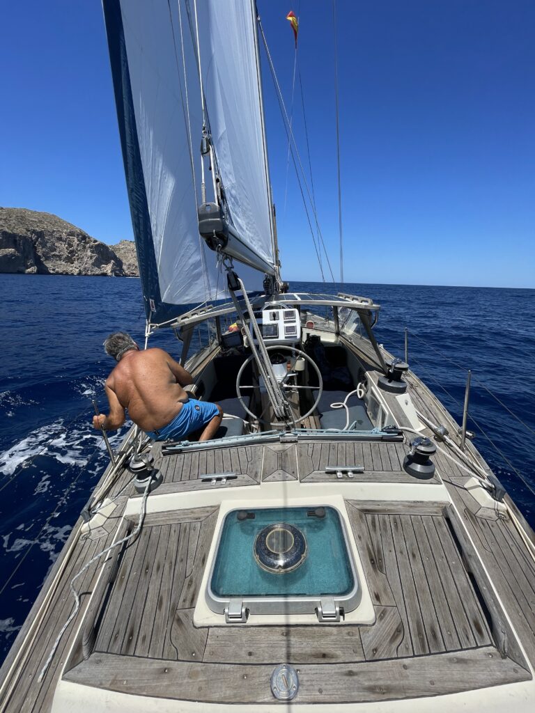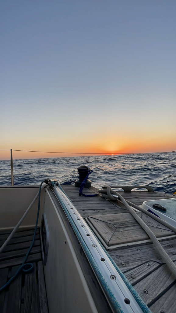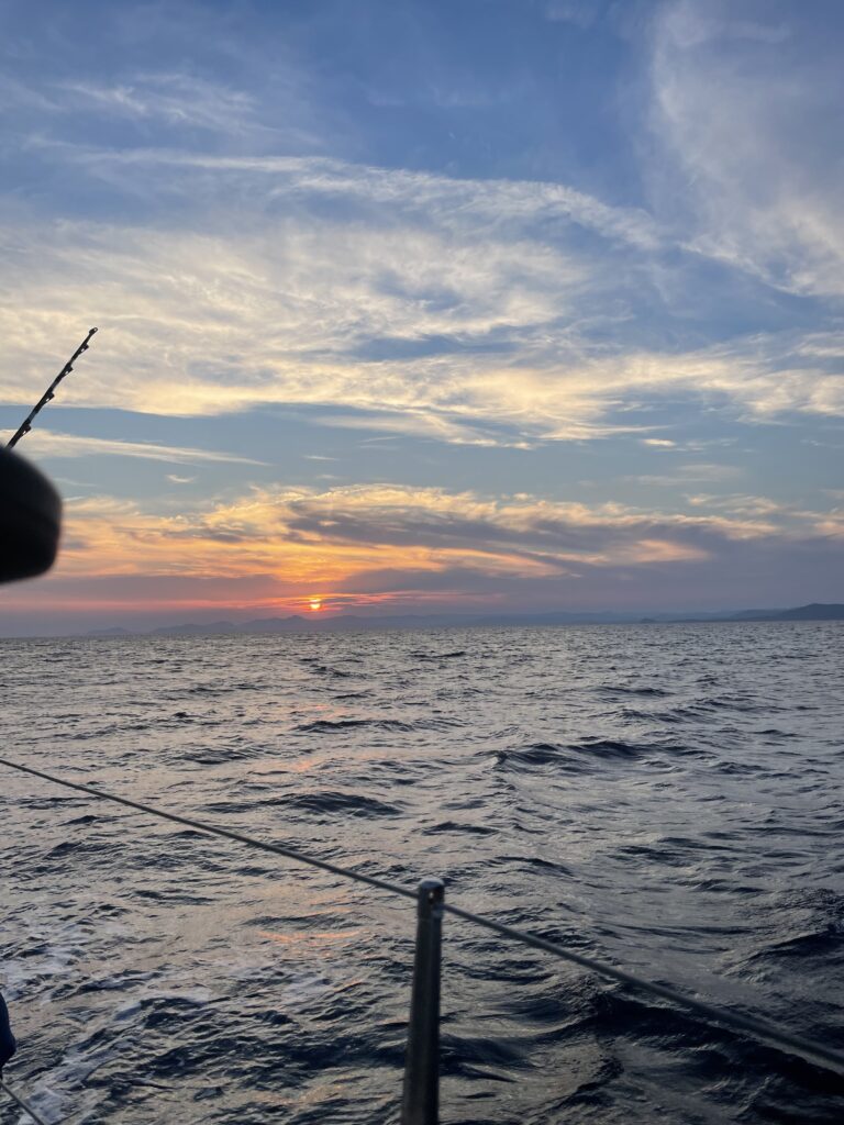 Le vent a monté jusqu’à 30 noeuds. La houle s’est formée jusqu’à 1m de haut. Les vagues tapent sur la coque. On avance à 5-6 nds et On est penchés a 20-30° à tenir avec des pointes à 40° avec les vagues. il est quasiment impossible de dormir, de bouger et ça a durée jusqu’à 16h. L’après midis a été entre coupe de siestes car on était vraiment fatigués. Le vent s’est ensuite calmé jusqu’à devoir allumer le moteur. On va pouvoir enfin se reposer un peu.