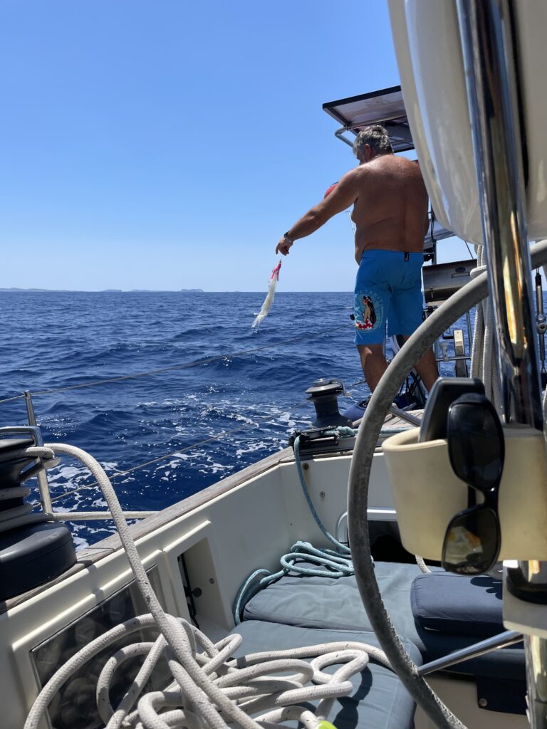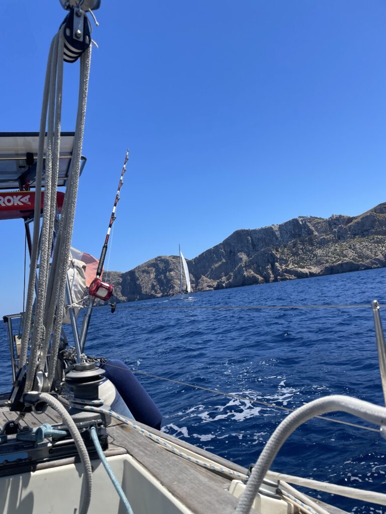 16h= on ressort la grande voile et le génois car le vent se calme à 13noeuds. Cap toujours au 209 direction les baléares. 229 nautics encore à faire. Papa a lancé la grande ligne de pêche.