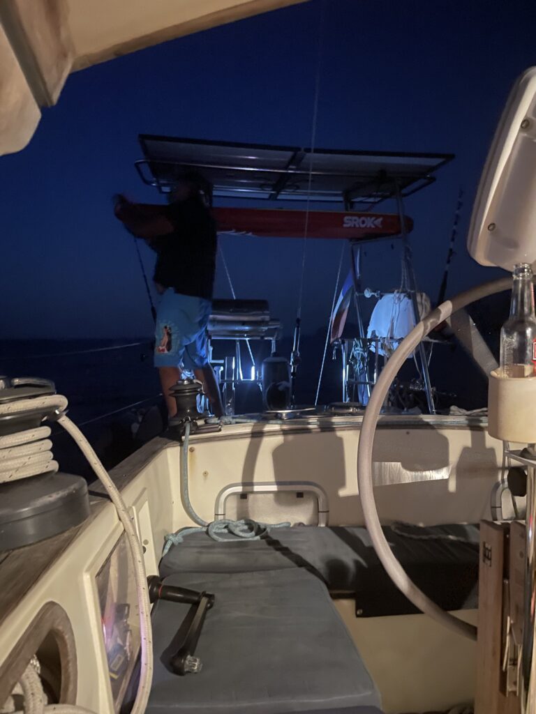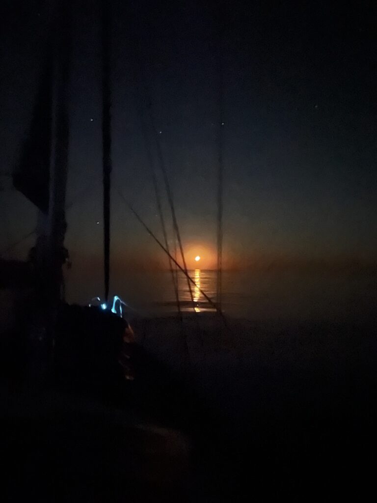 22h= on rentre les voiles et allumage moteur. Moi et maman commençons notre quart de nuit jusqu’à 3h30.