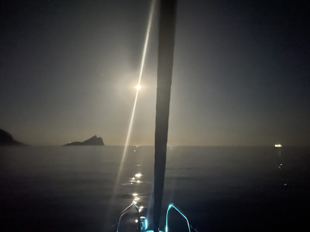Le premier quart de 22h a 3h du mat a été fait par moi et papa. Il préférait être là des le début car le vent risquait de forcir et il préférait être la dans cette éventualité pour réduire les voile rapidement. Le vent devait tenir jusqu’à 2-3h du mat. Je lui ai proposé de s’endormir et de monter la garde 40min puis me reposer 20min puis à nouveau 40min pour qu’il puisse se reposer. Au final, il ne s’est pas passé grand chose. A 2h30, maman nous a rejoint. Nous avons échangé nos places. A 3h du mat, allumage moteur. Le vent cale comme prévu jusqu’à 6h du mat On avance à la voile à 2-3 nds