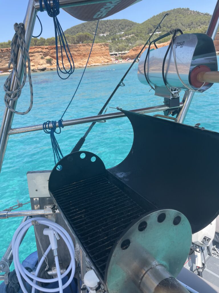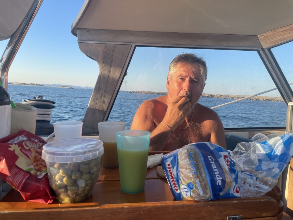 13h on mange des côtes d’agneaux au barbecue. Miam miam. Pour préparer le repas on a coupé le moteur. Au final, à la voile on avance bien à 3-4 noeuds avec 8 noeuds de vent au près. On a modifié notre cap à 50° du vent tribord amure pour aplatir le bateau et manger tranquillement.