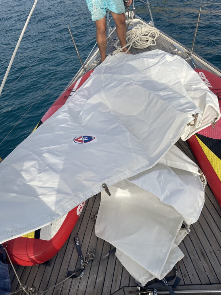 On a mis en route le désal pour produire de l’eau. Le capitaine a également rangé un peu les bouts car c’était le bazars. 5 écoutes et 2 boss de ftrein de bôme dans le cockpit. 1 grande voile, 2 génois, 2 tourmentin.