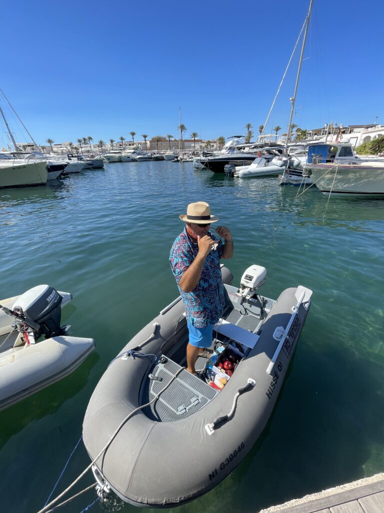 Notre capitaine posé dans le dinghy. Va savoir pourquoi ? Peut être pour être au frais les cheveux dans le vent. 😀