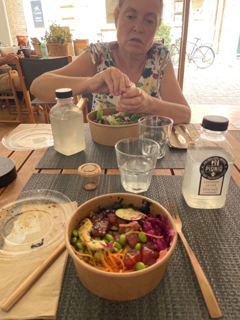 16h30= nous mettons le dingy à l’eau. Lauren par fatigue a fait une bêtise en tenant le mauvais boot qui lui a brûlé les doigts… nous avons bandez les mains. Rien de bien méchants juste un peu de peau arraché. Nous sommes allée a la marina de Mahon pour aller dans une pharmacie pour acheter de quoi soigner cette blessure. Ce fut un peu laborieux de se faire comprendre avec la pharmacienne. X)