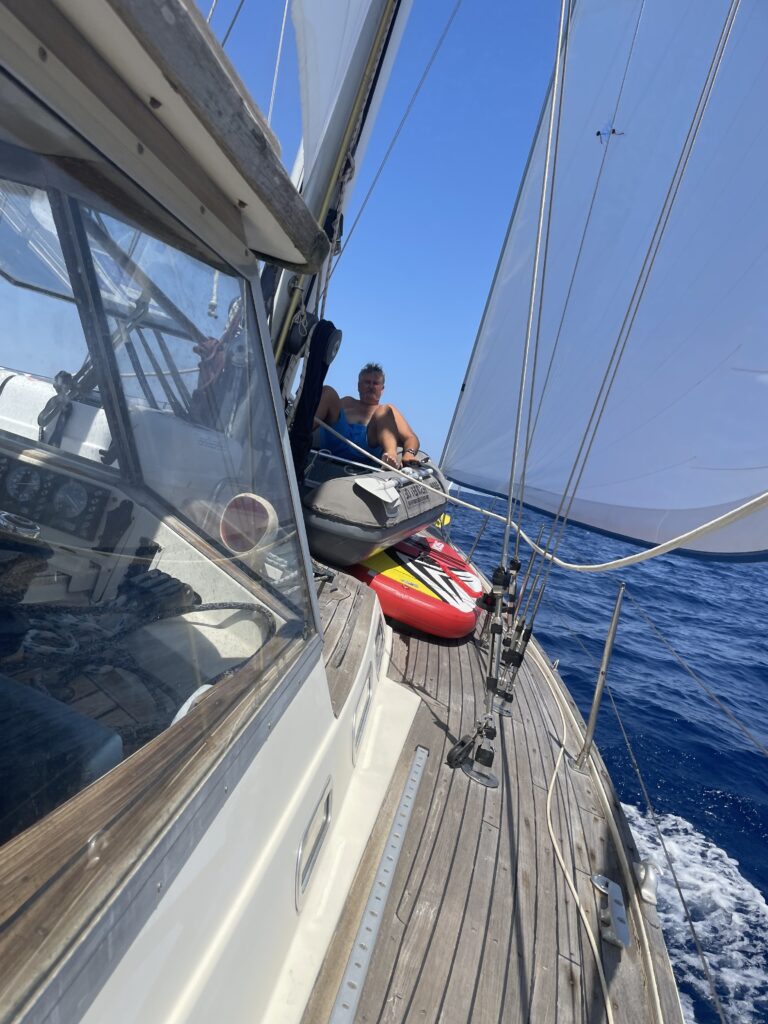 La mer est toujours très formée. On tente de prendre les vagues sur le côté mais la mer est assez confuse. On est comme dans une machine à laver. On avance à 2-3 noeuds et on est pas mal à la gîte. Nous sommes toujours en attente de récupérer le mistral de 20-25 noeuds.