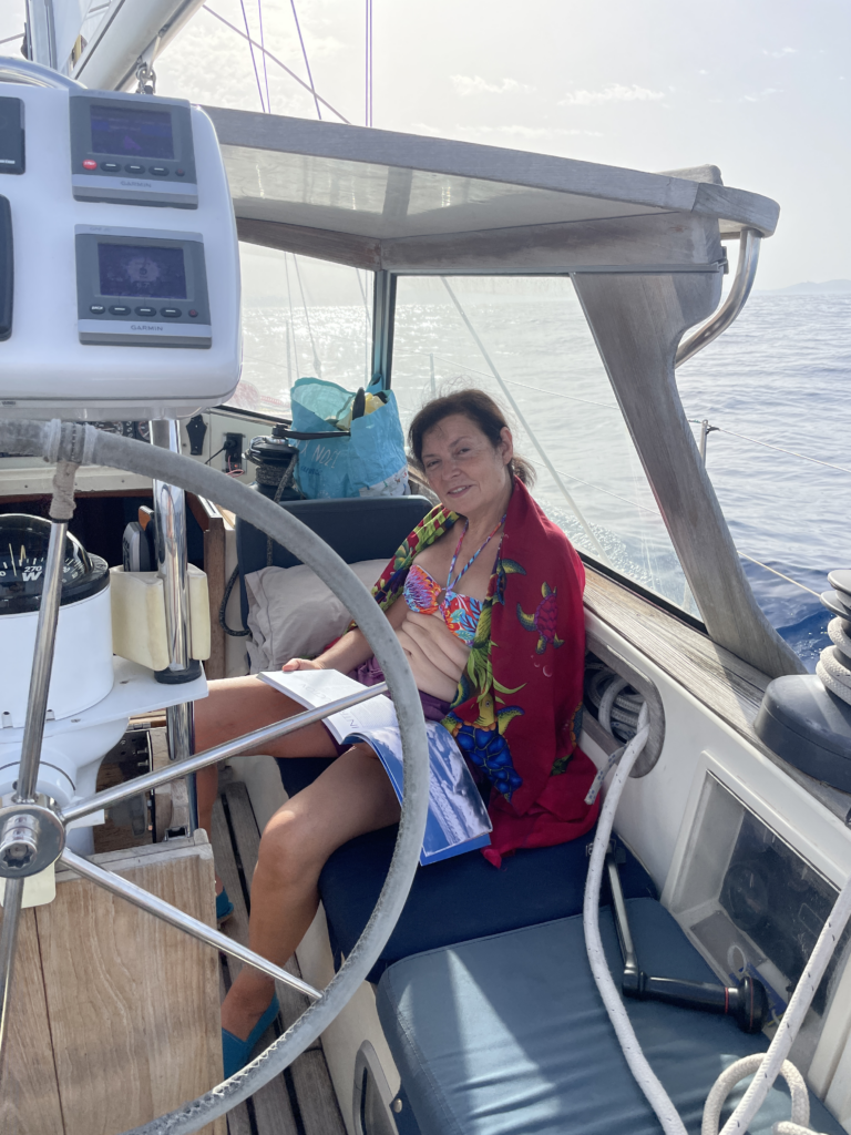 A 12h maman prend la barre pour sentir la conduite avec des voiles. Elle s’est entraînée à abattre et lofer au vent. Elle s’est bien débrouillée
