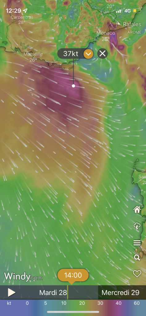 18h= suite à une mise à jour BMS (bulletin météo spécial), changement de cap vers st tropez au 253. Le fort coup de vent s’est déplacé avec 50 noeuds attendus en rafale.