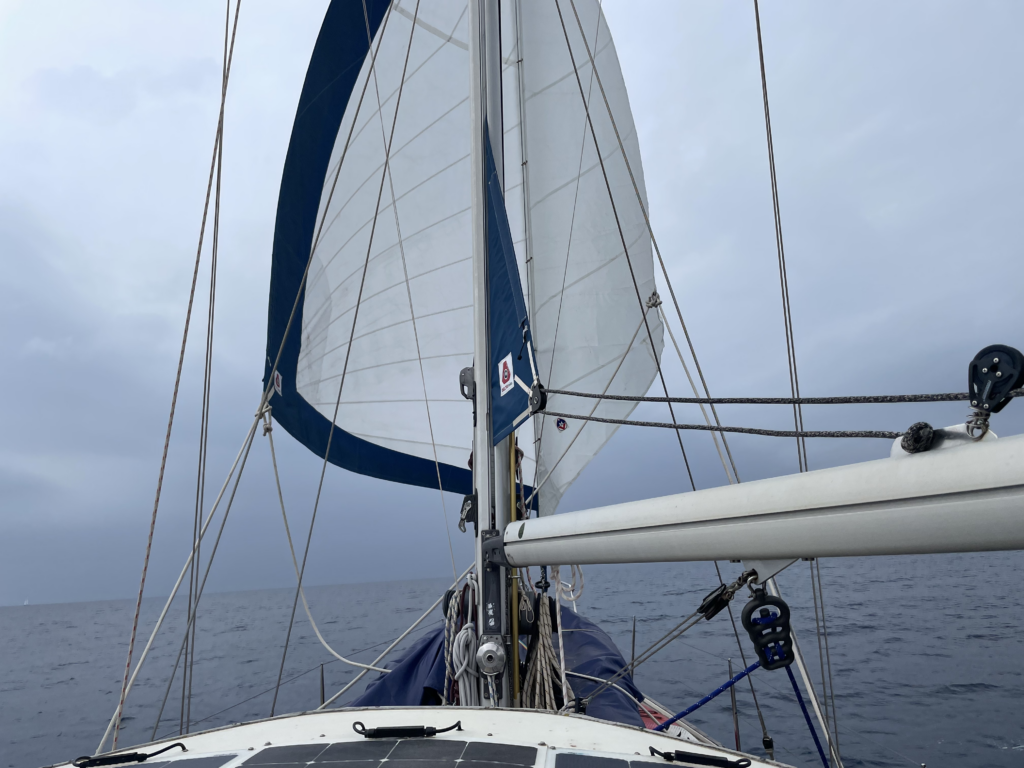 Un peu de vent s’est levé dans le début de mâtiné permettant de couper le moteur et mettre les voiles. Nous avons pu naviguer à la voile pendant 2-3h au portant avec 11-12 nds de vent. Nous avançons à bonne allure. Nous avons ensuite croisé un cargo qui faisait route de collision avec nous alors qu’on avait les voiles. Le capitaine du cargo ne répondait pas aux appel vhf. Nous avons du encore une fois rerouter et loffer le vent. Nous avons fini à la gîte pour pouvoir dyépasser en toute sécurité le cargo.